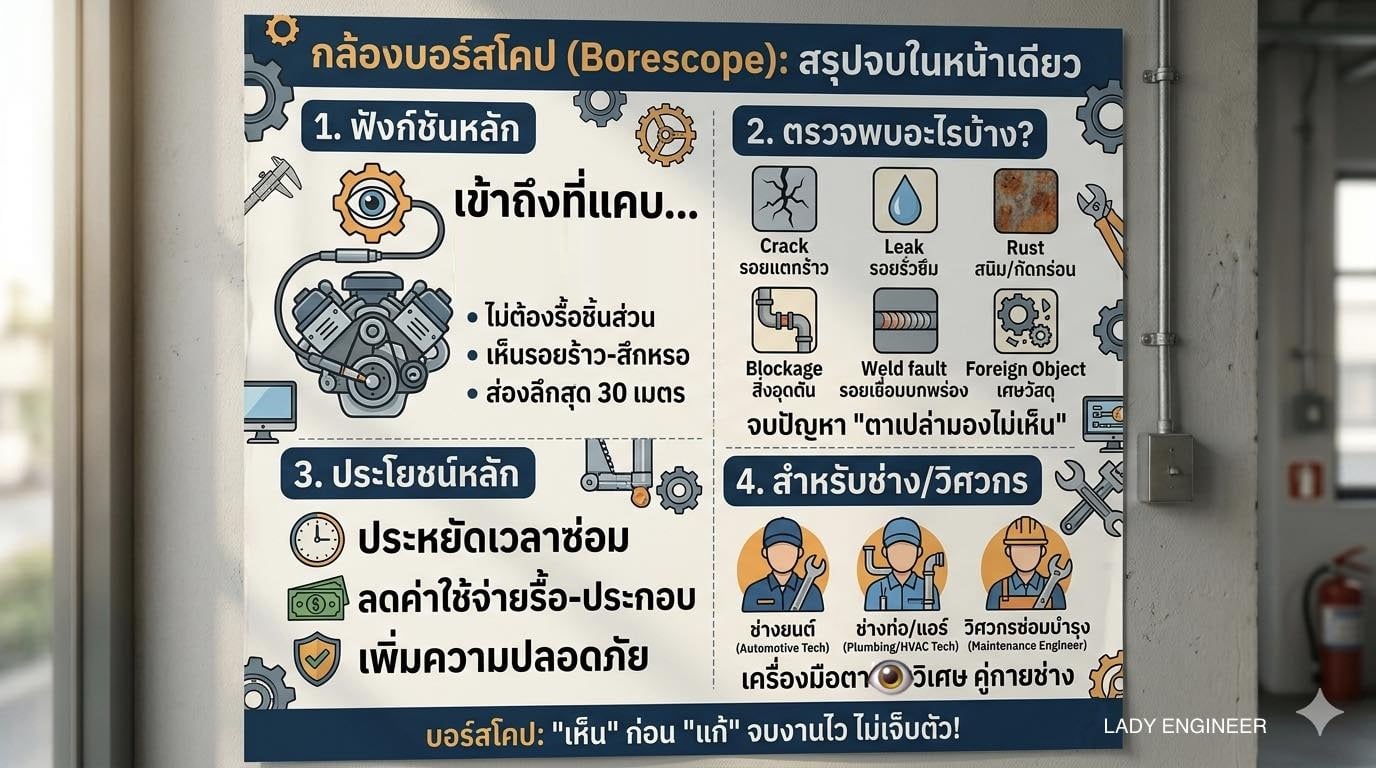 สรุปสั้นๆ: Borescope คือเครื่องมือที่เปลี่ยนจาก “การผ่าทำลาย” เป็น “การมองเห็น” ช่วยให้จบงานไว ไม่ต้องเจ็บตัวกับค่ารื้อ หรือผ่าทำลายงาน