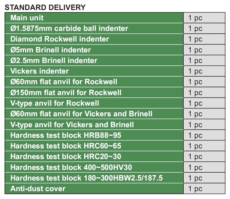 • อุปกรณ์มาตรฐาน: ประกอบด้วยหัวกดเพชร, หัวกดบอลเหล็ก, บล็อกมาตรฐาน, และโต๊ะวางชิ้นงานแบบต่างๆ
