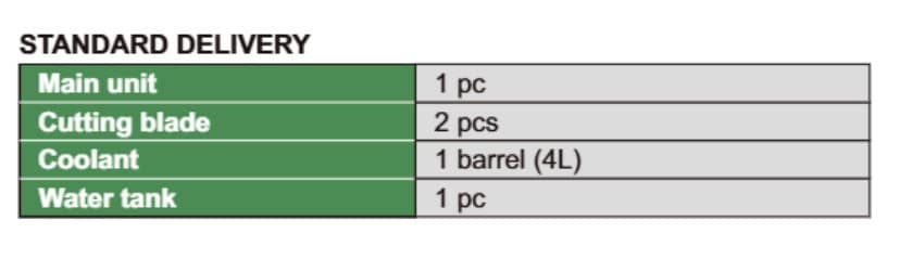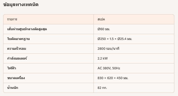 ใบตัด Ø250 มม. ความเร็วรอบ 2800 รอบ/นาที, กำลังมอเตอร์ 2.2 กิโลวัตต์ และใช้ไฟฟ้า 380V 50Hz